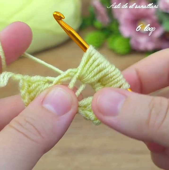 3. YO, insert again, pull up another loop — 7 loops on hook.