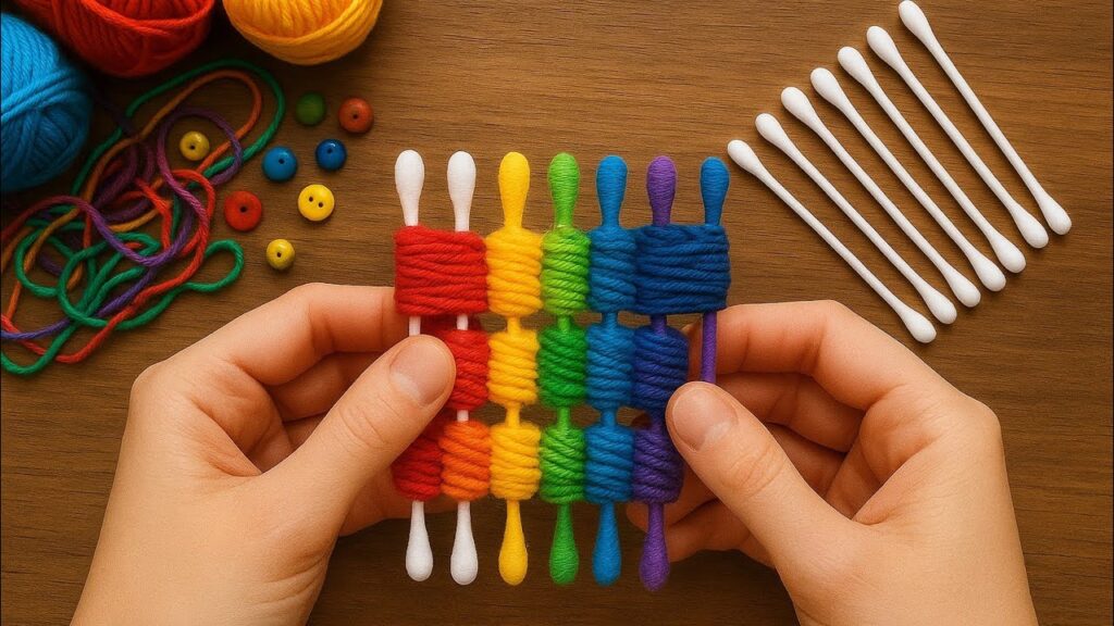 Sure 😊 Here is a step-by-step explanation so you can make exactly the same yarn weaving with cotton swabs as in the picture.