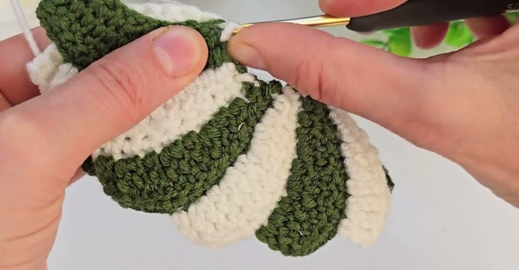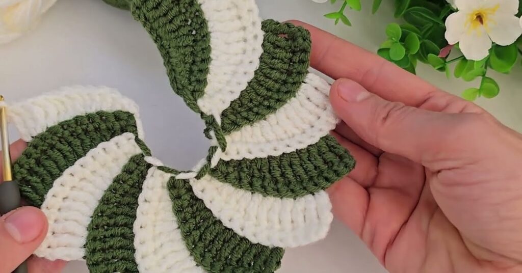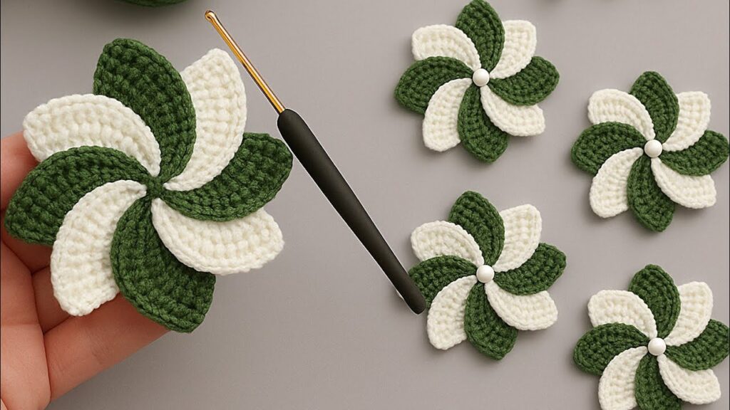 This crochet flower pattern in your photo looks like a pinwheel-style 3D crochet flower made from two-tone petals (green and white). Hereโs a step-by-step guide to make it: