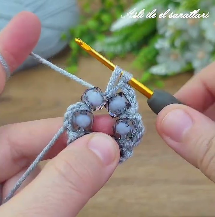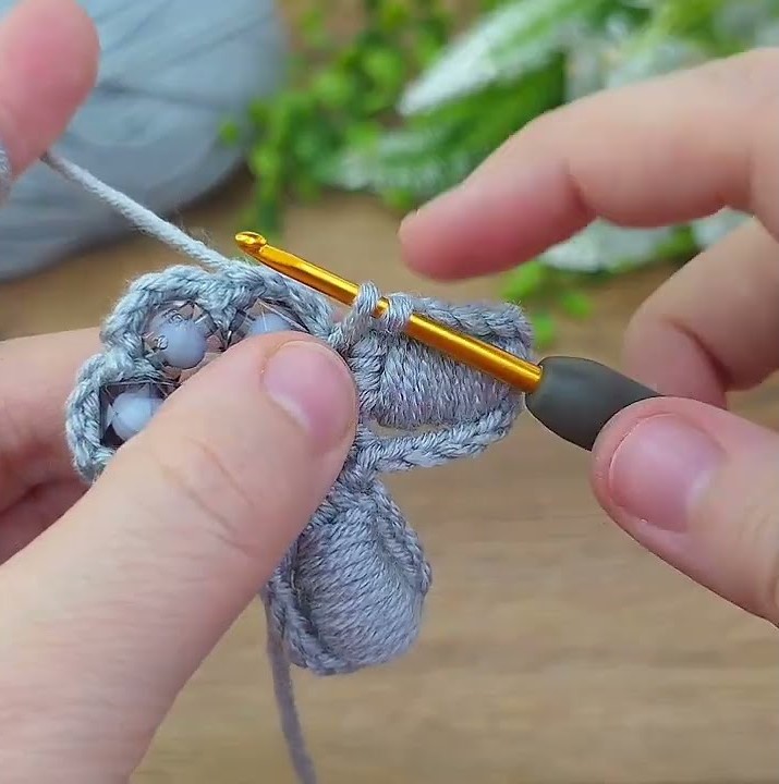 - Repeat this: slide another bead → make 1 sc into ring → repeat until you have 5 sc with beads around.