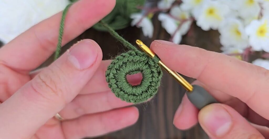 Each petal will be worked directly onto the green ring, one by one.