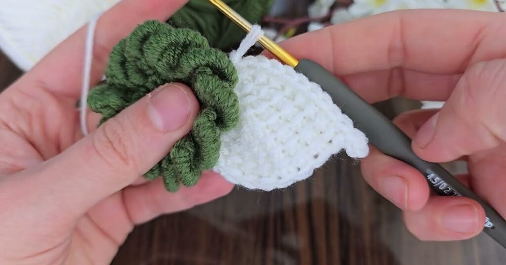 • Slip stitch into the next stitch on the green ring to secure the petal base.