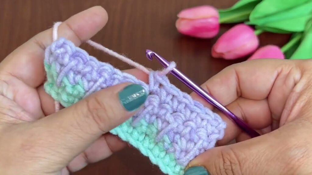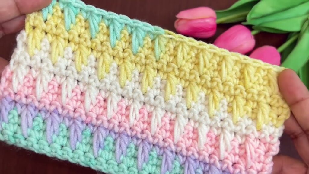 The texture and color transitions in your image come from a combination of puff (or bean) stitches and double crochet rows that create vertical “drops” of color. I’ll break it down completely.