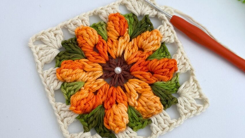 This is a crochet flower granny square, specifically a 3D flower motif pattern. It’s made by creating a raised flower in the center with layered petals and surrounding it with a square border. Here’s how you can make it step-by-step (you’ll need to know basic crochet stitches):