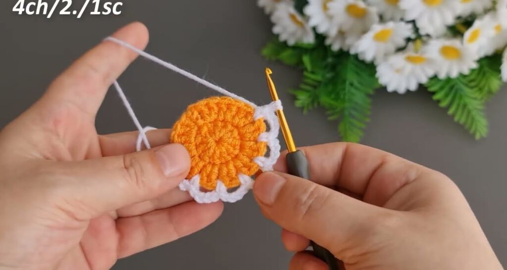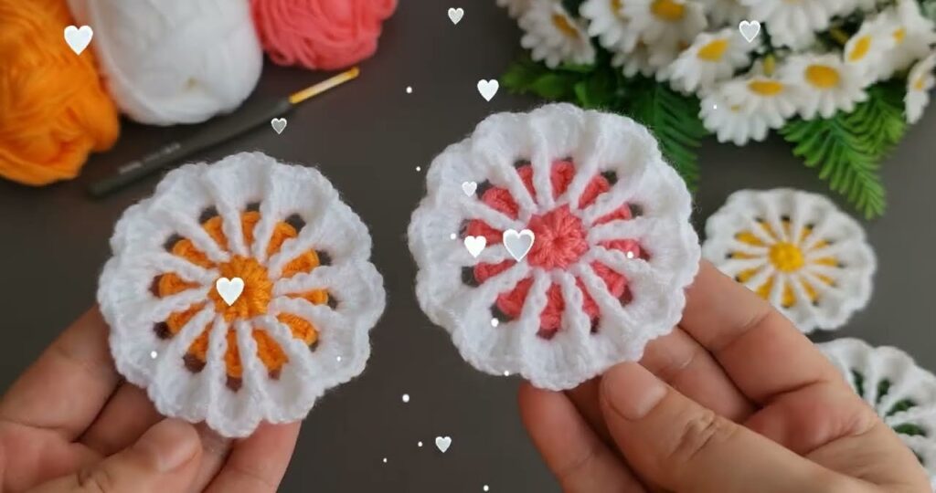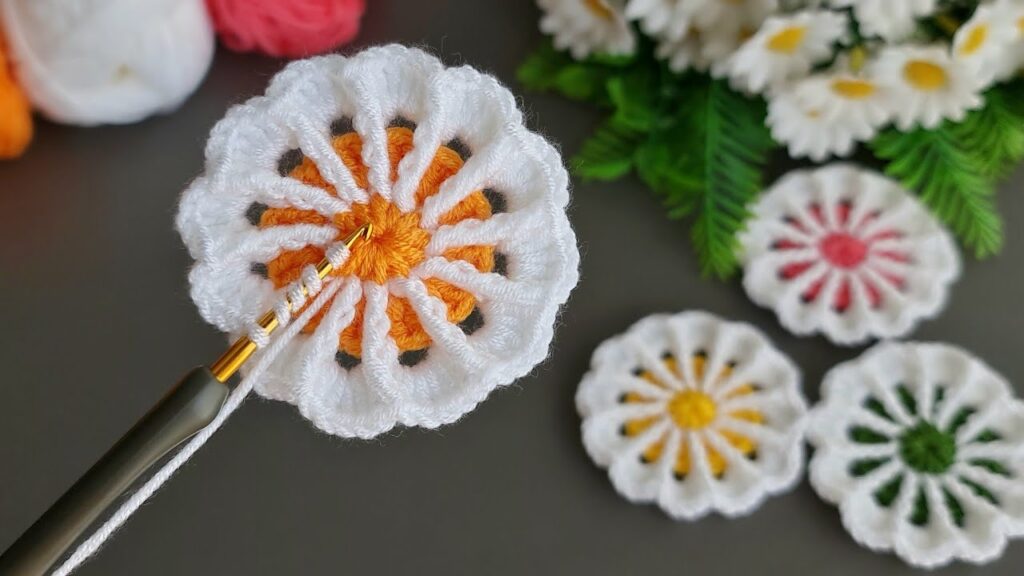 Thatβs a crochet daisy flower motif πΌ. Iβll guide you step by step on how to make it: