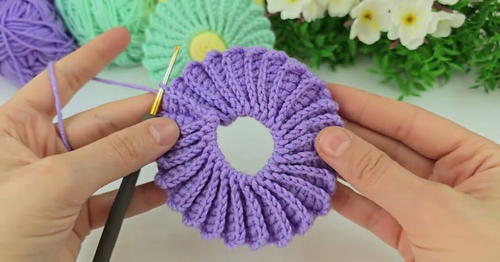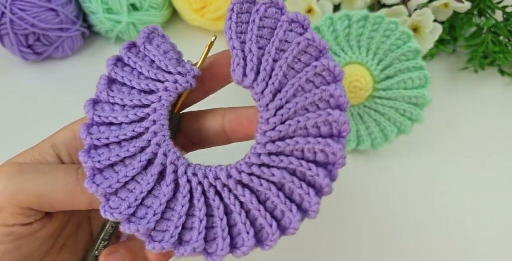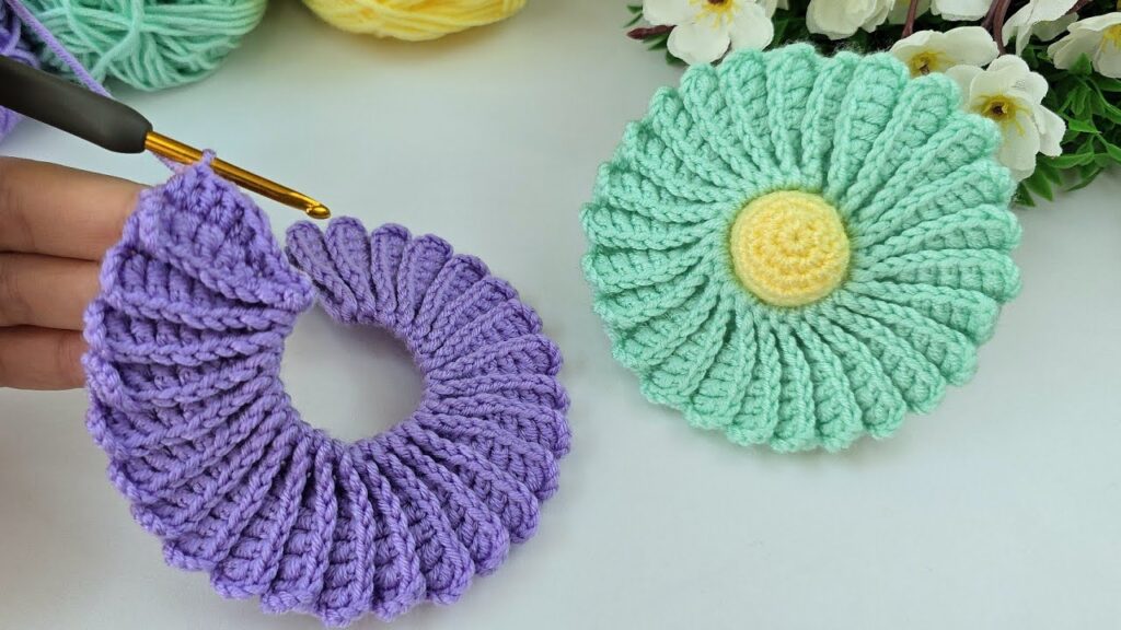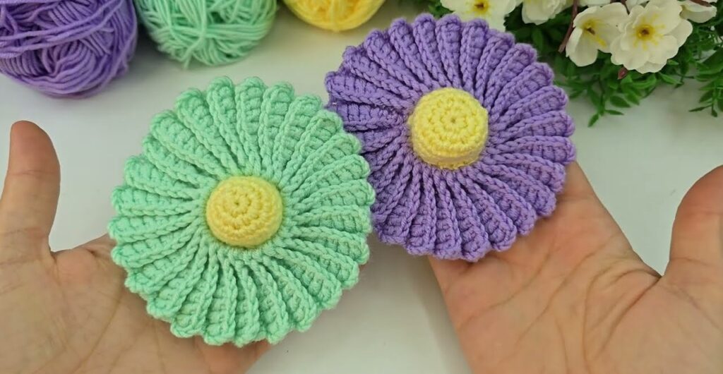 - Yarn: 2 colors — one for the flower center (yellow) and one for the petals (purple or mint).